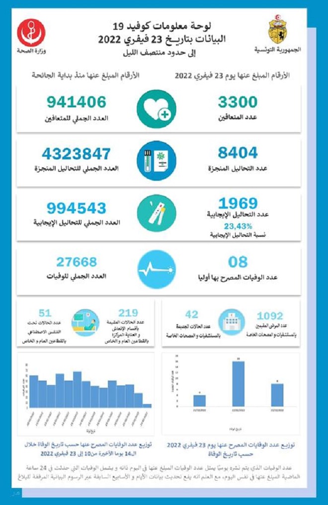 Tunisie Tribune (Bilan du Covid-19 en Tunisie) –1969 nouveaux cas de coronavirus et huit décès ont été enregistrés le 23 février 2022, a annoncé le ministère de la Santé, ce vendredi.