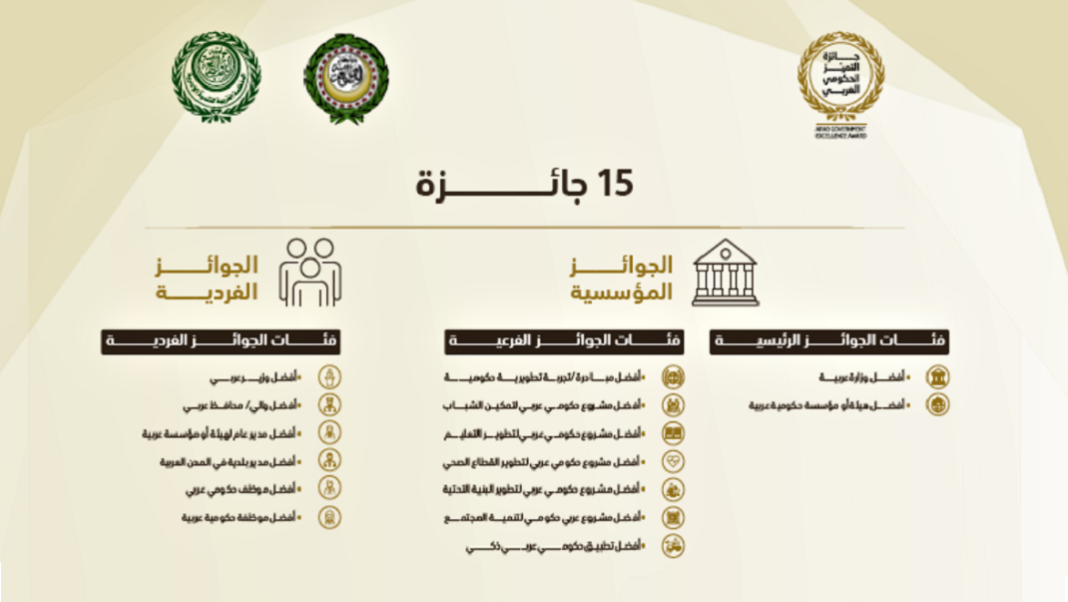 Les gouvernements des pays arabes participeront au deuxième cycle du Prix d’excellence du gouvernement arabe, au cours duquel 15 lauréats seront honorés dans les catégories de prix institutionnels et individuels, qui comprennent le meilleur ministère arabe, la meilleure agence ou institution gouvernementale arabe, le meilleur Ministre arabe, le meilleur gouverneur/gouverneur arabe et le meilleur directeur général Un Arabe, le meilleur directeur municipal des villes arabes et le meilleur employé masculin et féminin au niveau arabe.