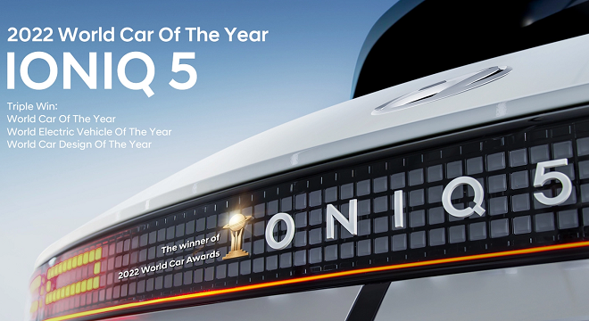 Pour le prix « World Electric Vehicle of the Year », le jury a sélectionné IONIQ 5 parmi 11 véhicules en lice au départ, puis parmi les trois finalistes restants. Pour être éligibles à ce prix, les véhicules doivent être exclusivement animés par un ou plusieurs moteurs électriques, produits à au moins 5 000 unités par an et commercialisés sur au moins deux marchés majeurs sur au moins deux continents et ce, sur la période du 1er janvier 2021 au 30 mars 2022.