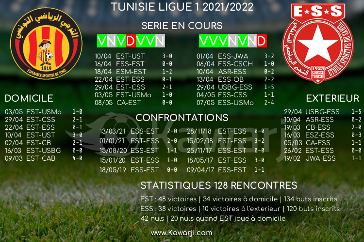 Tunisie Tribune (Ligue 1) – Avant la rencontre prévue ce dimanche pour le compte de la 4ème journée de play-off en Ligue 1 tunisienne 2021-2022, voici l’historique et les statistiques relatifs à cette confrontation :