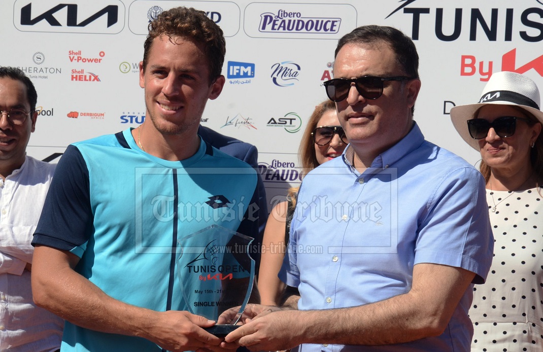 Le vainqueur du tournoi « Tunis Open by KIA » est l’espagnol Roberto Carballes Baena 102e mondial (en bleu)… qui a battu G Brouwer par le score de (6/1, 6/1). Le Trophée lui a été remise par Riadh Annabi.