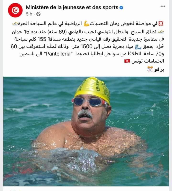 Il est à rappeler que le ministère a annoncé, hier, que Nejib Belhedi a battu un nouveau record mondial en traversant 155 kilomètres de l’île italienne de Pantelleria à Hammamet en 66 heures.