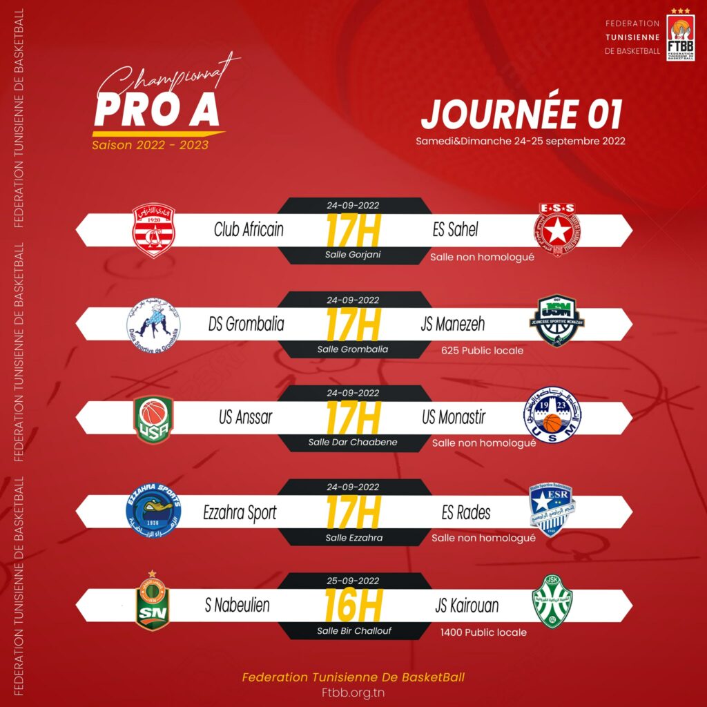 Tunisie Tribune (Basket-ball) – La Fédération Tunisienne de Basket-ball a communiqué le programme de la première journée du championnat 2022-2023 de Pro A.