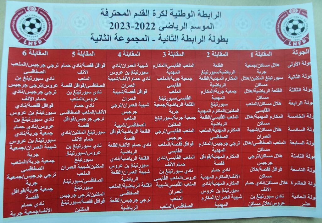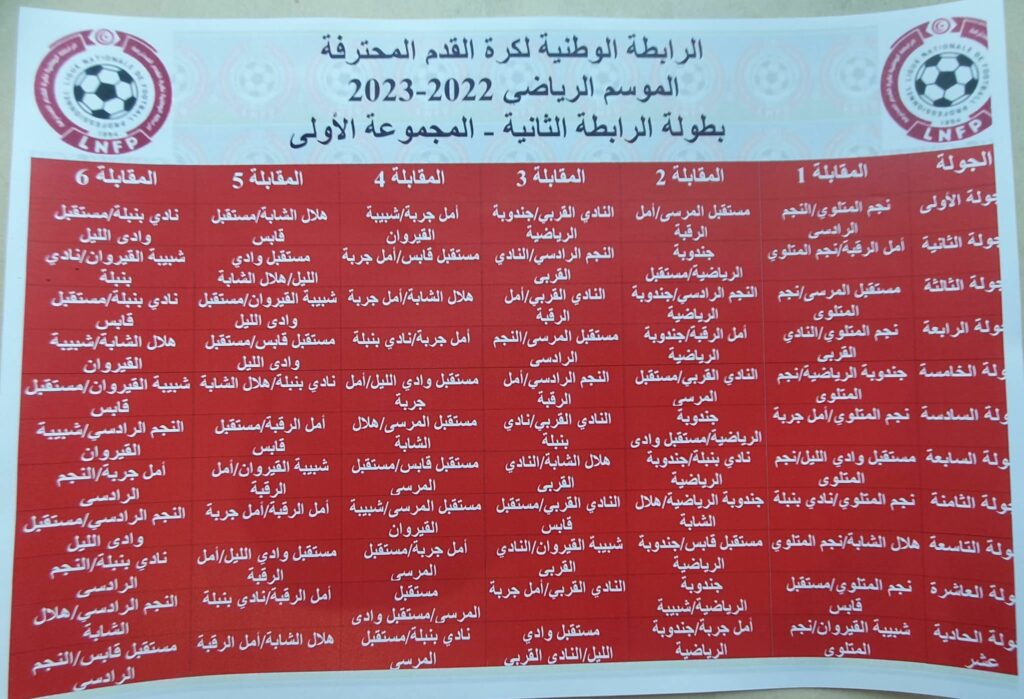Accueil - A LA UNE Calendrier de la saison 2022-2023 en Ligue 2 Calendrier de la saison 2022-2023 en Ligue 2 Par Med Ben Mohmed - 22 septembre 2022 0 Tunisie Tribune (Ligue 2) – Voici le calendrier général de la saison 2022-2023 en Ligue 2 : Groupe A : Groupe B : ARTICLES CONNEXESPLUS DE L'AUTEUR - A LA UNE Ligue des Champions UEFA Féminine : Programme des huitièmes et quarts de finale - A LA UNE Un accord de l’ONU simplifie le commerce et transport mondial - A LA UNE Au Yémen, Guterres redoute un nouvel embrasement régional - A LA UNE Handball : La sélection tunisienne effectuera un stage en Espagne - A LA UNE Basket-ball : Date du tirage au sort des 16èmes de finale de la Coupe de Tunisie - A LA UNE Ligue 1 : Les premiers transferts du mercato hivernal 2025-2026 - A LA UNE La Tunisie bat le Botswana - A LA UNE Coupure de la distribution de l’eau à Gabès - A LA UNE Stephen Wright, PDG de Windracers : « Nous ne sommes qu’aux prémices de cette technologie de drones » DERNIERES NEWS Ligue des Champions UEFA Féminine : Programme des huitièmes et quarts de finale Med Ben Mohmed - 18 décembre 2025 0 Tunisie-Tribune (Ligue des Champions UEFA Féminine) - Voici la liste des clubs qualifiés à l'issue de la phase Un accord de l’ONU simplifie le commerce et transport mondial 18 décembre 2025 Au Yémen, Guterres redoute un nouvel embrasement régional 18 décembre 2025 Handball : La sélection tunisienne effectuera un stage en Espagne 18 décembre 2025 Basket-ball : Date du tirage au sort des 16èmes de finale... 18 décembre 2025 Ligue 1 : Les premiers transferts du mercato hivernal 2025-2026 18 décembre 2025 La Tunisie bat le Botswana 18 décembre 2025 Coupure de la distribution de l’eau à Gabès 18 décembre 2025 Stephen Wright, PDG de Windracers : « Nous ne sommes qu’aux prémices de... 18 décembre 2025 Composition rentrante de la Tunisie devant le Botswana 18 décembre 2025 La STEG poursuit le rééchelonnement des impayés de ses clients 18 décembre 2025 Des pluies éparses et provisoirement orageuses attendues sur le Sud, ce... 18 décembre 2025 Affaire Chawki Tabib : l’audience reportée 18 décembre 2025 Ooredoo élue Service Client de l’Année 2026 pour la 7ᵉ fois... 18 décembre 2025 Accord entre le Club Africain et Mohamed Dräger 18 décembre 2025 Pluxee Tunisie élue Service Client de l’Année 2026 pour la 7ᵉ... 18 décembre 2025 Sélection tunisienne : Naim Sliti sera présent à la CAN 2025 18 décembre 2025 Hajj 2026 : Premier départ en mai 18 décembre 2025 La Bourse de Tunis classée en tête des marchés arabes 18 décembre 2025 FIFA: Deux nouveaux clubs de Ligue 1 interdits de recrutement 18 décembre 2025 Ligue 1 : Programme des rencontres amicales 18 décembre 2025 Conférence League : Programme des matches de la 6ème journée 18 décembre 2025 Programme des retransmissions TV des rencontres prévues ce jeudi 18 décembre 2025 Mehrez Berrajeh revient à l’Olympique de Béja 18 décembre 2025 Sélection tunisienne : Dernier test amical avant le départ au Maroc 18 décembre 2025 Basket-ball : Six clubs qualifiés en phase de play-off en Pro... 18 décembre 2025 Mondial 2026 : Des billets à prix réduit pour les supporters... 18 décembre 2025 Gaza : les agences humanitaires appellent Israël à lever les nouvelles... 18 décembre 2025 Vladimir Poutine promet d’atteindre ses objectifs en Ukraine 18 décembre 2025 Le Parlement européen vote pour faciliter l’accès à l’avortement dans l’UE 18 décembre 2025 La magistrate Monia Ammar nommée membre de la Commission d’enquête de... 18 décembre 2025 Prévisions météo du jeudi 18 décembre 2025 18 décembre 2025 Programme des matches amicaux de l’Union Sportive Monastirienne 17 décembre 2025 Marche populaire contre l’ingérence étrangère 17 décembre 2025 L’inscription du « khôl arabe » à l’UNESCO 17 décembre 2025 Kef : Dynamisme accru aux postes-frontaliers 17 décembre 2025 Lassaad Dridi officialisé à la tête du Club Sportif Constantinois 17 décembre 2025 France: Grève reconduite au Louvre 17 décembre 2025 Revirement Stratégique sur la voiture électrique : Face à des pertes... 17 décembre 2025 La Grande-Bretagne va réintégrer le programme Erasmus+ de l’UE 17 décembre 2025 Donald Trump accentue la pression sur le Venezuela 17 décembre 2025 Voitures électriques : En Europe, les ventes progressent alors que des... 17 décembre 2025 Coupe Arabe des Nations 2025 : Les arbitres des matches de... 17 décembre 2025 Handball : Programme de mercredi à la 19ème journée Elites 17 décembre 2025 Journalistes tués à Gaza : le bilan tragique des opérations militaires... 17 décembre 2025 Accélération de la colonisation israélienne : colline après colline, la paix... 17 décembre 2025 Un nouveau variant de la grippe se propage rapidement 17 décembre 2025 Programme des retransmissions TV des rencontres de ce mercredi 17 décembre 2025 Liste complète des lauréats des trophées The Best FIFA Football Awards... 17 décembre 2025 Affaire Al Karama Holding : report du procès 17 décembre 2025 15ᵉ anniversaire du déclenchement de la révolution 17 décembre 2025 Inauguration de la première centrale photovoltaïque à Kairouan 17 décembre 2025