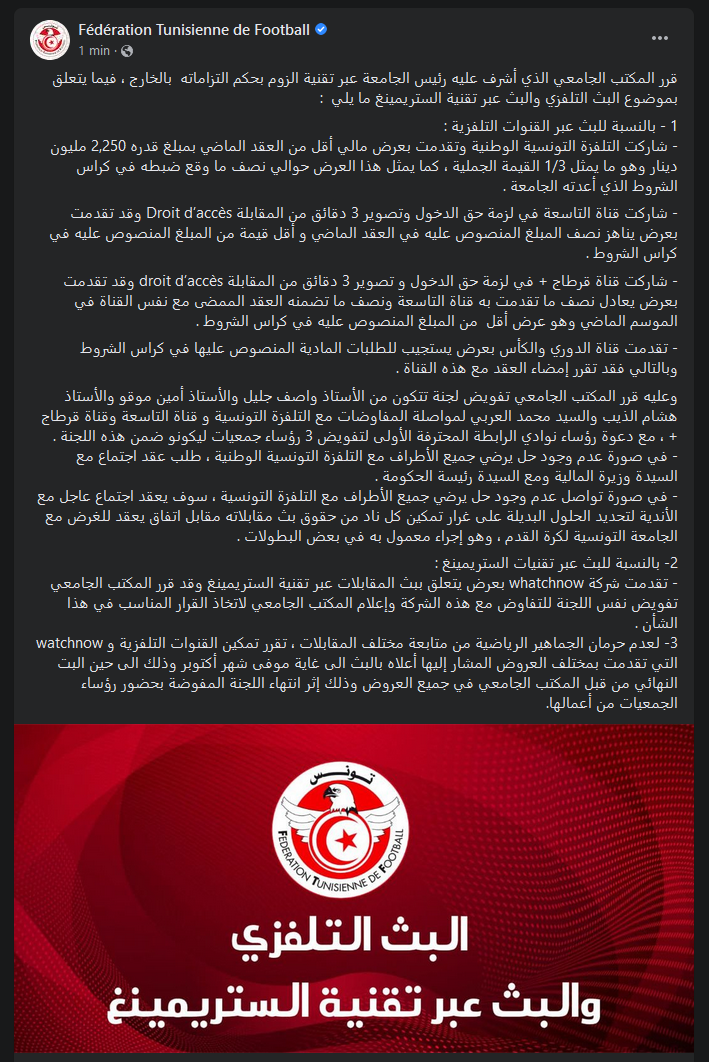 Tunisie Tribune (FTF-streaming & Retransmissions TV) – Le bureau de la fédération tunisienne de football, supervisé à distance par son président (en vertu de ses engagements à l’étranger) a traité la question des retransmissions télévisuelles ainsi que celle de la diffusion via la technologie de streaming, a décidé ce qui suit un communiqué :