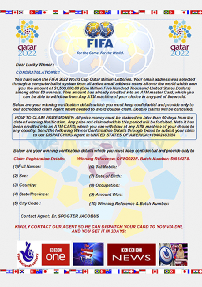 Dans ce stratagème éprouvé, les criminels font croire aux victimes qu’ils ont gagné un prix en euros, un billet ou un pass complet pour assister à un match en personne. L’objectif n’est pourtant pas si séduisant. Le pirate tente de collecter vos données personnelles ou votre argent ou parvenir à vous faire télécharger des logiciels malveillants. Nos chercheurs ont repéré un certain nombre de campagnes d’hameçonnage qui visent dans ce sens. Pour encaisser vos « gains », il suffit de remplir quelques champs via un formulaire et de fournir des informations personnelles, telles que votre nom complet, votre date de naissance et votre numéro de téléphone. Mais pour récupérer vos gains, des taxes ou des frais sont à payer. Si vous cédez, les escrocs ont atteint leurs objectifs : ils ont volé votre argent et vos informations personnelles. Un gain financier immédiat, ainsi que futur : utiliser ou revendre vos données personnelles à d’autres escrocs.