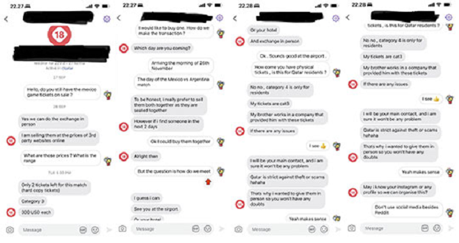 Un certain nombre de personnes ont déjà signalé avoir été contactées par courriel par des « officiels de la FIFA » qui proposaient des billets à la vente. Sur Reddit se partagent des échanges de messages avec ces personnes proposant de faux billets.