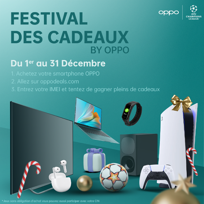 Tunisie Tribune (OPPO) – Du 1er au 31 décembre 2022, OPPO annonce tout un festival de cadeaux de fin d’année. Toutes les personnes qui achètent des smartphones OPPO peuvent participer sur la plateforme www.oppodeals.com à un tirage au sort hebdomadaire faisant gagner plein de produits électroniques : téléviseurs, ordinateurs portables, home cinéma, Play stations 5, bracelets connectés ‘‘OPPO bands’’, écouteurs sans fils ‘‘Enco Buds’’, etc…