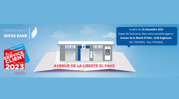 Tunisie Tribune (WIFAK BANK) – En poursuivant son extension de réseau,WIFAK BANK annonce l’ouvertureofficielle de sa 42ème agence, à partir du Mercredi 21 Décembre 2022, Agence WIFAK BANK El Fahs sise à Av de la Liberté El Fahs, 1140, Zaghouan.