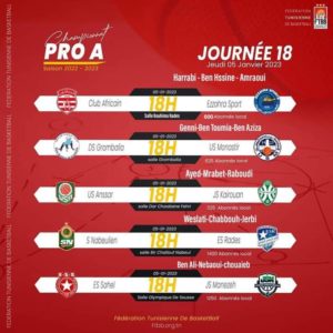 Tunisie Tribune (Basket – Pro A)- Ci-après le programme des matches comptant pour la 18ème journée en championnat Pro A de basketball qui seront disputés ce jeudi 05 janvier :