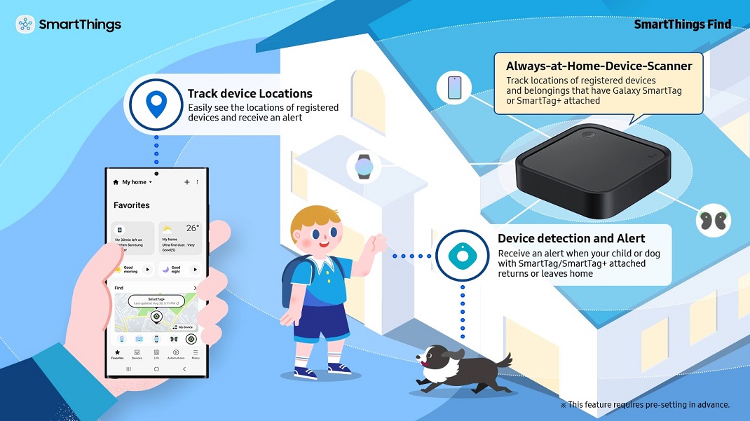 Servant de scanner d’appareils toujours à la maison, SmartThings Station aide les utilisateurs de Samsung Galaxy à suivre l’emplacement de leurs appareils enregistrés – des smartphones, tablettes, montres et écouteurs aux effets personnels tels que des clés ou un portefeuille qui ont un Galaxy Dispositif SmartTag ou SmartTag+ connecté. En recherchant régulièrement des appareils, SmartThings Station indiquera aux utilisateurs l’emplacement des appareils intelligents connectés ou des étiquettes autour de la maison et partagera une alerte sur le smartphone de l’utilisateur lorsqu’une étiquette ou un appareil quitte ou rentre chez lui.