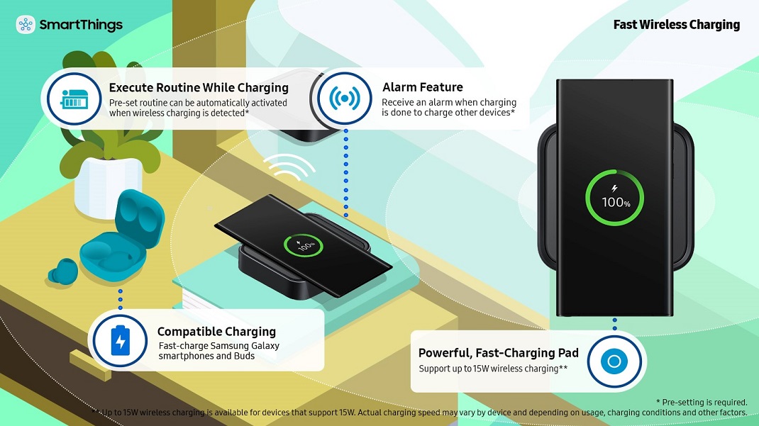 SmartThings Station est également un chargeur puissant prenant en charge jusqu’à 15 W de charge sans fil. La charge rapide est un complément ingénieux à un hub Smart Home car elle s’adapte bien au rythme de vie. Les utilisateurs peuvent choisir de recevoir une alerte lorsque la charge est terminée afin qu’ils puissent reprendre le jeu là où ils l’ont laissé ou basculer pour charger un autre appareil.