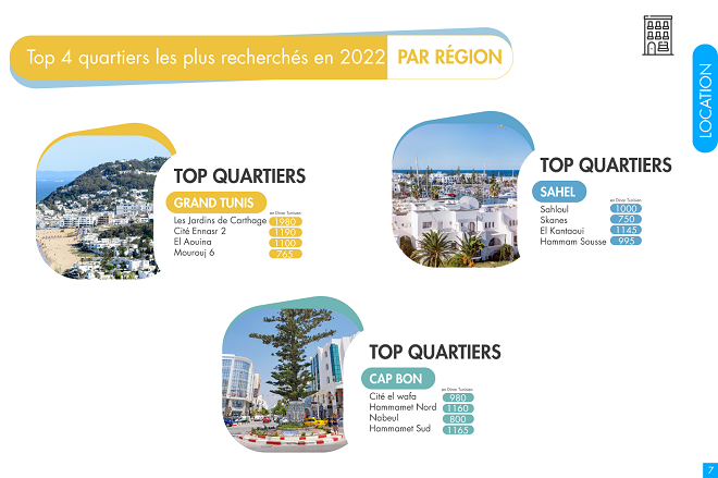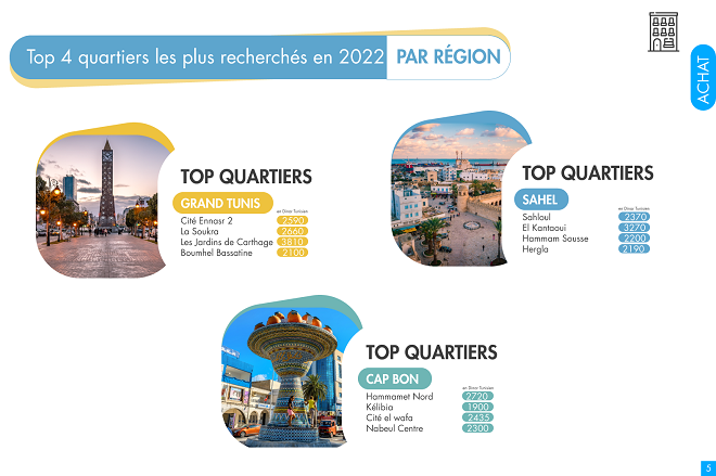 Pour la région du Grand Tunis : Cité Ennasr 2 (2590 DT), La Soukra (2660 DT), Les Jardins de Carthage (3810 DT) et Boumhel Bassatine (2100 DT) sont les quartiers les plus recherchés par les Tunisiens pour l’achat d’un appartement.