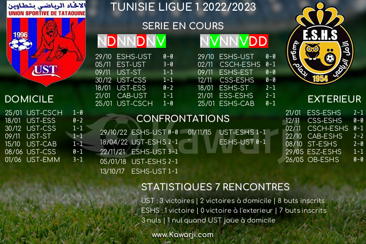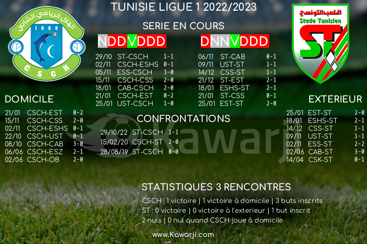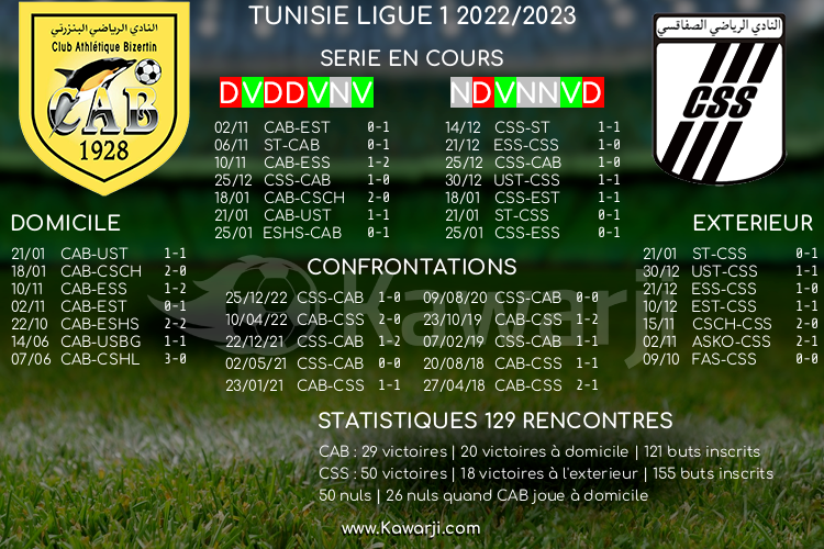 Tunisie Tribune (Ligue 1) – Avant les rencontres prévues ce lundi pour le compte de la 11ème journée du groupe A en Ligue 1 tunisienne 2022-2023, voici l’historique et les statistiques relatifs à ces confrontations :