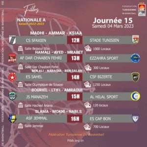 D’autre part, voici le programme des matches comptant pour la 15e journée de la division Nationale A Seniors dames :