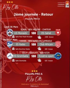 Tunisie Tribune (Basket / Play-offs Pro A)- Ci-après le programme des matches comptant pour la 2e journée de la division Pro A (phase play-offs) seniors garçons pour ce lundi 06 mars :
