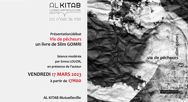 Tunisie Tribune (Vie de pêcheur de Slim Gomri) – Slim Gomri présentera son ouvrage Vie de Pêcheur, le vendredi 17 mars à 17H00 à la librairie Al Kitab, Mutuelle ville. La séance sera modérée par Emna Louzyr.