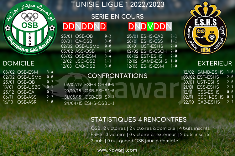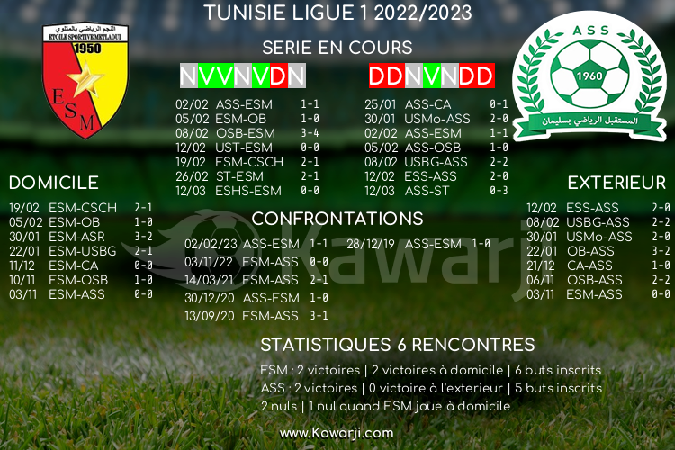 Tunisie Tribune (Ligue 1) – Avant les rencontres prévues ce dimanche pour le compte de la 2ème journée de la phase de play-out en Ligue 1 tunisienne 2022-2023, voici l’historique et les statistiques relatifs à ces confrontations :