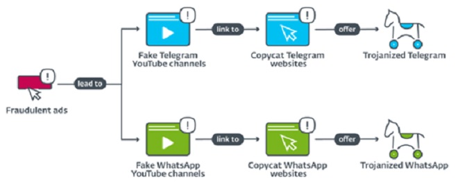 - Leurs auteurs s’attaquent aux cryptomonnaie des victimes à l’aide des applications Telegram et WhatsApp Android et Windows infectées par des chevaux de Troie.