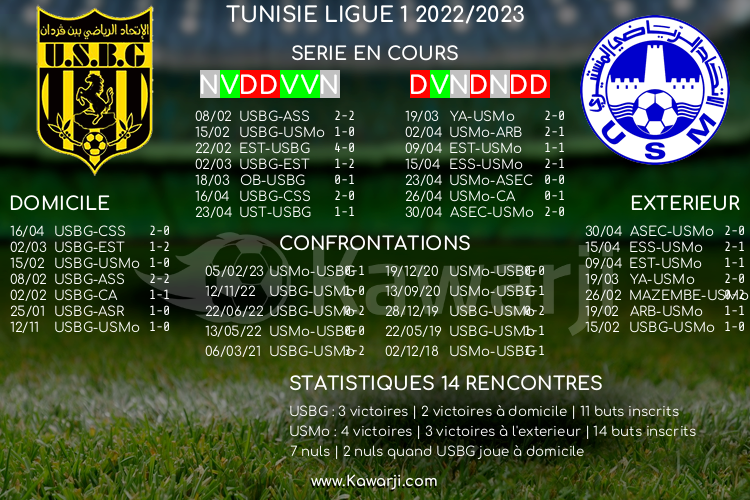Tunisie Tribune (Ligue 1) – Avant la rencontre prévue ce jeudi pour le compte de la 5ème journée de la phase de play-off en Ligue 1 tunisienne 2022-2023, voici l’historique et les statistiques relatifs à cette confrontation :