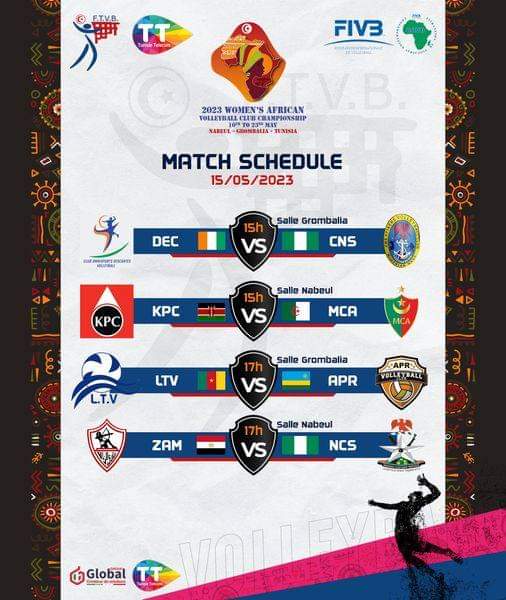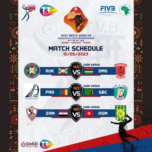 Tunisie Tribune (Volley – Championnat d’Afrique des clubs)- Ce lundi place aux matches de la 5ème journée du Championnat d’Afrique des Clubs 2023 seniors hommes à Kélibia et Haouaria, selon le programme suivant :