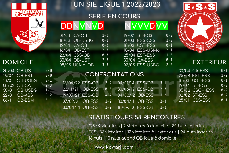 Tunisie Tribune (Ligue 1) – Avant la rencontre prévue ce samedi pour le compte de la 7ème journée de la phase de play-off en Ligue 1 tunisienne 2022-2023, voici l’historique et les statistiques relatifs à cette confrontation :