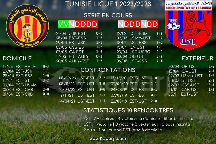 Tunisie Tribune (Ligue 1) – Avant la rencontre prévue ce mardi pour le compte de la 7ème journée de la phase de play-off en Ligue 1 tunisienne 2022-2023, voici l’historique et les statistiques relatifs à cette confrontation :