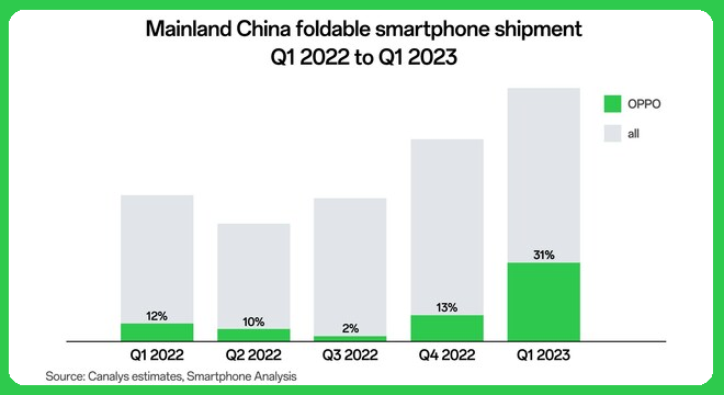 Counterpoint Research estime le taux de croissance annuel composé des expéditions mondiales de smartphones pliables de 2019 à 2025 à 114 %, avec des chiffres qui devraient quadrupler entre 2022 et 2025, pour atteindre 55 millions d’unités. Les équipementiers chinois, dont OPPO, se sont précipités pour étendre et renforcer leur présence sur le marché des téléphones pliables, contribuant à ce que la Chine atteigne sa première part de marché de 26 % du marché en 2022.