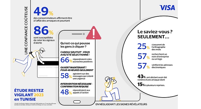 Tunisie-Tribune (Nouvelle Étude De Visa) – Selon la dernière étude ‘Stay Secure’ de Visa, l’excès de confiance expose les consommateurs tunisiens à être victimes de fraudes. Bien que près de la moitié des personnes interrogées (49%) affirment être suffisamment averties pour éviter les escroqueries en ligne et par téléphone, la réalité est que huit personnes sur dix (86%) sont susceptibles de ne pas tenir compte des signes d’alerte qui suggèrent une activité criminelle en ligne.