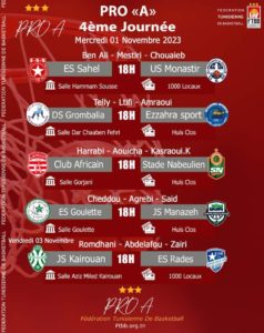 Tunisie-Tribune (Basket – Championnat Pro A)- Ci-après le programme des matches de la quatrième journée du Championnat Pro A 2023, publié par la FTBB, et qui auront lieu ce mercredi 1er novembre :