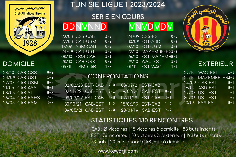 Tunisie-Tribune (Ligue 1) – Avant la rencontre en retard prévue ce mercredi pour le compte de la 7ème journée de Ligue 1 tunisienne 2023-2024, voici l’historique et les statistiques relatifs à cette confrontation :