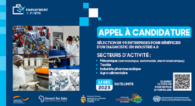 L’objectif visé de cet appel à candidature est de sélectionner 95 entreprises opérant dans les secteurs de la mécanique (aéronautique, automobile, électromécanique), Textile, Industrie pharmaceutique et Agro-alimentaire pour bénéficier de l’appui du projet pour la réalisation d’un diagnostic de maturité en Industrie 4.0 qui devra aboutir à l’élaboration d’un plan d’accompagnement et à l’implémentation de solutions 4.0 permettant d’optimiser leur performance, qualité, flexibilité et leur compétitivité sectorielle.