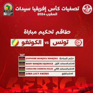 Tunisie-Tribune (CAN féminine 2024)- La commission d’arbitrage au sein de la CAF a désigné un staff arbitral kényan pour siffler le match aller du 2ème tour qualificatif à la CAN féminine 2024 au Maroc, entre la Tunisie et le Congo, programmé demain jeudi au Stade municipal de Soliman à 14h30 (HT) :
