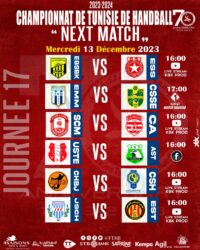 Tunisie-Tribune (Hand – J17 Elite)- Ci-après le programme tv détaillé des matches de la 17e journée du championnat du Hand Elite seniors ce mercredi 13 décembre, avec le sommet El Makarem Mahdia – CS Sakiet Ezzit, qui sera à suivre en direct sur Watania 1 à partir de 17h00 et un live streaming de toutes les rencontres :