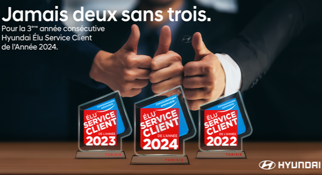 Tunisie-Tribune (Hyundai Tunisie)  – Alpha Hyundai Motor, distributeur officiel de la firme automobile sud-coréenne Hyundai en Tunisie pour les véhicules particuliers et leader du marché automobile en 2022 et 2023 (YTD) est fier d’annoncer qu’il a obtenu le titre de “ Elu Service Client de l’Année 2024″ pour la troisième année consécutive. Cette reconnaissance prestigieuse souligne l’engagement continu de la marque envers l’excellence du service client et sa capacité à maintenir des niveaux exceptionnels d’engagement client pour l’année à venir.