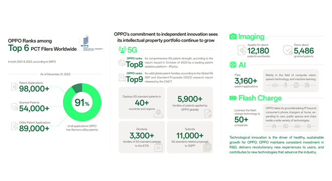 En tant que détenteur des droits-clés des brevets essentiels à la norme 5G et leader mondial de l’innovation en matière d’appareils intelligents, OPPO est à la fois un innovateur et un implémenteur de normes technologiques. Au 31 décembre 2023, OPPO avait déployé des brevets sur les normes de communication 5G dans plus de 40 pays et régions, avec un total de plus de 5900 familles de brevets dans le monde, plus de 3300 brevets sur les normes 5G déclarés à l’ETSI et plus de 11000 documents standards soumis au 3GPP. Selon le rapport 5G 2023 publié par l’Académie chinoise des technologies de l’information et des communications (CAICT) et un rapport d’IPlytics publié en octobre 2023, OPPO se classe parmi les meilleures entreprises au monde en termes de force de brevet essentielle à la norme 5G.
