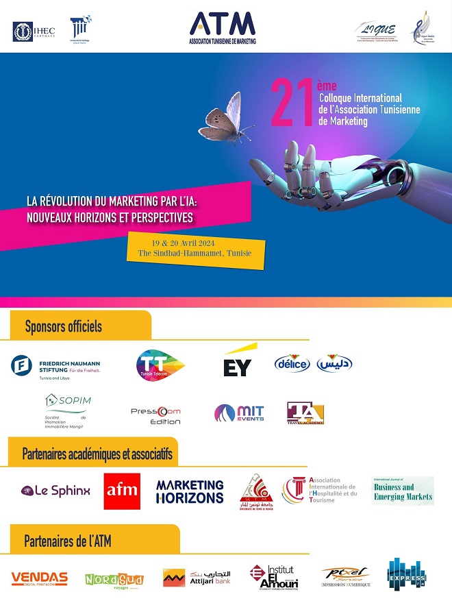 Tunisie-Tribune (21ème Colloque international de l’Association Tunisienne du Marketing – L’Association Tunisienne du Marketing (ATM) a clôturé avec succès son 21ème Colloque international qui s’est tenu les 19 et 20 avril 2024 à l’hôtel Sindbad Hammamet. Sous le thème « La Révolution du Marketing par l’IA : Nouveaux Horizons et Perspectives », cette édition a été marquée par des échanges scientifiques et managériaux enrichissants entre académiciens et professionnels du marketing.