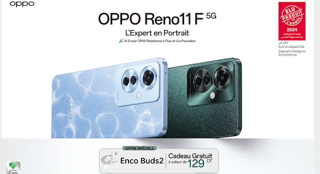 OPPO a aussi lancé une offre spéciale et avantageuse, durant le mois de mai 2024, pour toute commande effectuée de ce dernier modèle, en offrant une gratuité sur les écouteurs sans fil, Enco Buds 2 (d’une valeur de 129 dinars), alors que le prix public conseillé du Reno11 F 5G est de 1499 dinars tunisiens.