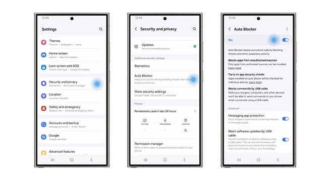 Le blocage automatique est une question de choix : il vous donne un ensemble de mesures de sécurité supplémentaires en option pour que vous soyez entièrement en contrôle de choisir si vous souhaitez explorer les personnalisations activées par l’écosystème de Galaxy. Le bloqueur automatique protégera votre appareil Galaxy et vos données personnelles de diverses façons en vérifiant les logiciels malveillants et autres menaces à la cybersécurité et en bloquant les activités malveillantes.
