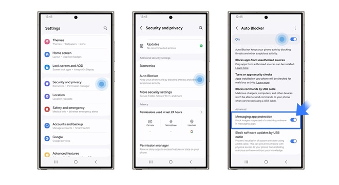 La manière dont Galaxy vous protège contre les cybermenaces et vous permet de contrôler la confidentialité de votre appareil grâce au bloqueur automatique, à la protection des messages et aux mises à jour de sécurité