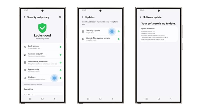 Bien qu’il soit important d’avoir des fonctions de sécurité robustes, il est également essentiel de les tenir à jour afin de demeurer protégé contre les menaces les plus récentes. C’est pourquoi Samsung donne désormais jusqu’à sept ans de mises à jour de sécurité et sept ans de mises à niveau du système d’exploitation, à commencer par la gamme Galaxy S24.[1] Il s’agit de la plus longue période de soutien logiciel actuellement disponible pour les appareils mobiles, permettant ainsi aux utilisateurs de garder leurs téléphones en sécurité et de manière plus fiable plus longtemps.