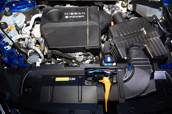 Le système e-Power, composé d’une batterie à haut rendement, d’un moteur essence 3 cylindres 1,5 litre turbo à taux de compression variable générant 158 ch, d’un générateur, d’un ondulateur et d’un moteur électrique de 116 kw, permet de parcourir jusqu’à mille kilomètres avec un seul plein.
