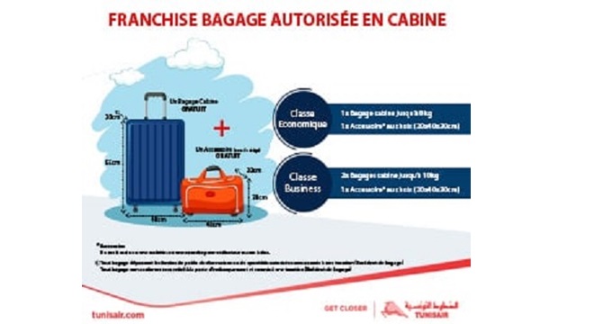 Tunisair a rappelé que le poids total du bagage cabine et de l’accessoire ne doit pas dépasser la franchise autorisée par classe.