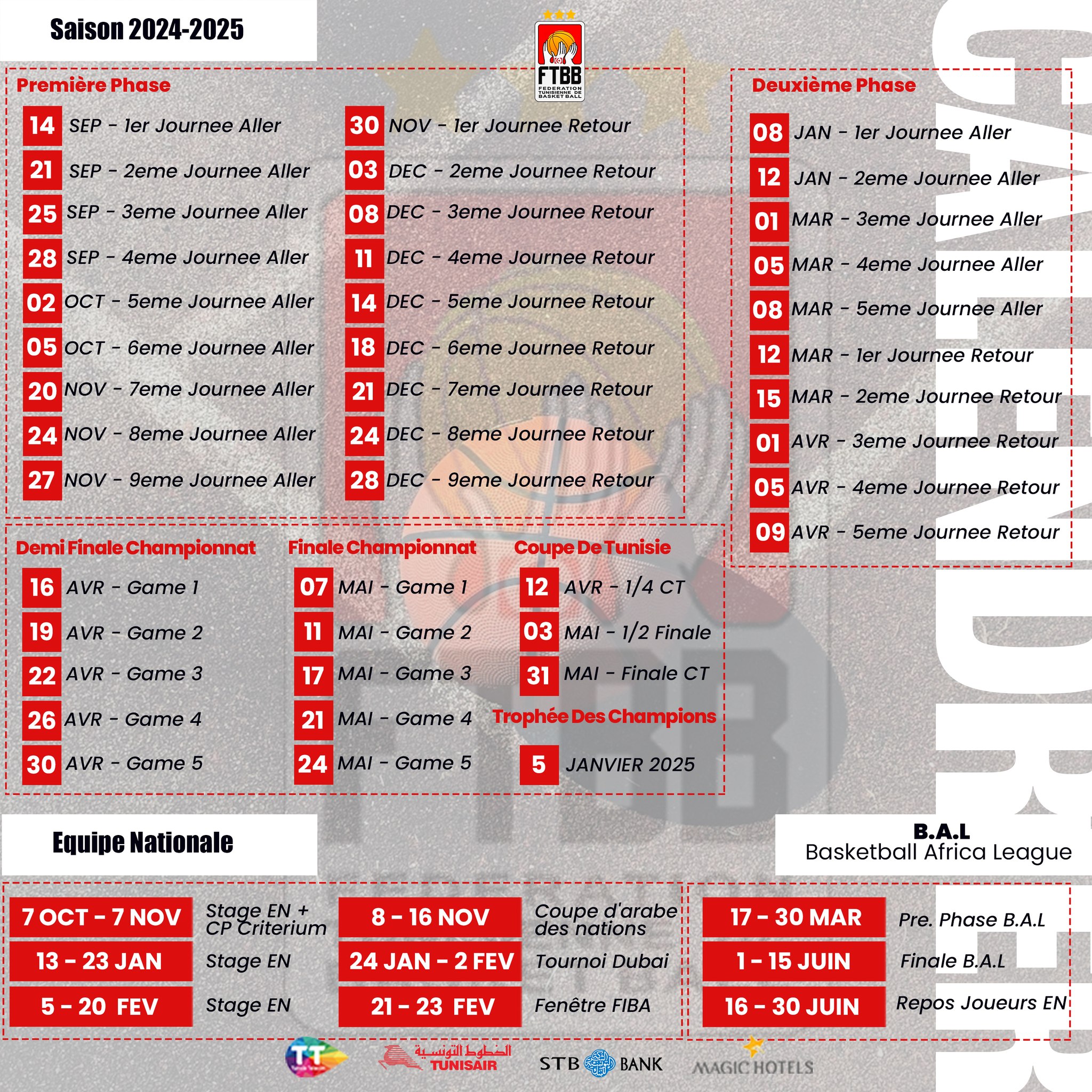 Tunisie-Tribune (Basket-ball) – La Fédération Tunisienne de Basket-ball a communiqué le calendrier complet de la saison 2024-2025.