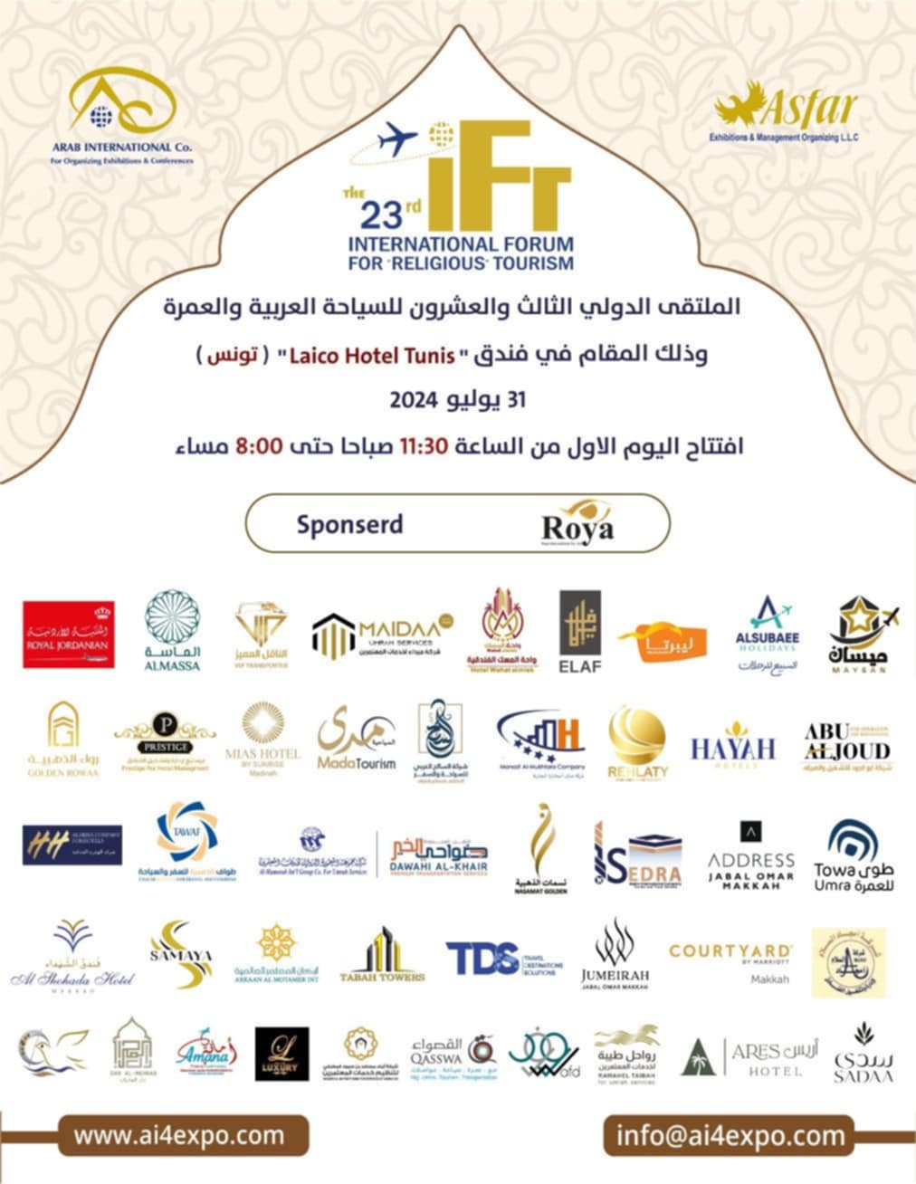Tunisie-Tribune (23ème Forum International Arabe du Tourisme) Dans le cadre des préparatifs de la prochaine saison de la Omra , ASFAR, (la Société Internationale Arabe des Foires et Salons) organise ce mercredi 31 août 2024, le 23ème Forum international Arabe du Tourisme et de la Omra à Tunis.