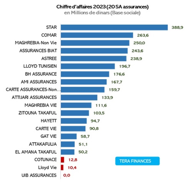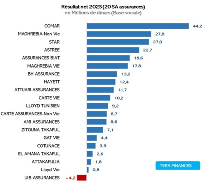 COMAR détient la plus forte capacité bénéficiaire avec un résultat net 2023 de 44,2 millions de dinars, suivie par Maghrebia Non-vie (27,8 millions de dinars) coude à coude avec STAR (27 millions de dinars).
