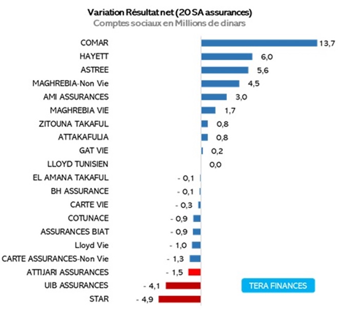 En absolu, COMAR, HAYETT et ASTREE réalisent les plus fortes hausses. À l’opposé, STAR, UIB Assurances (en démarrage) et Attijari Assurances enregistrent les plus fortes baisses.