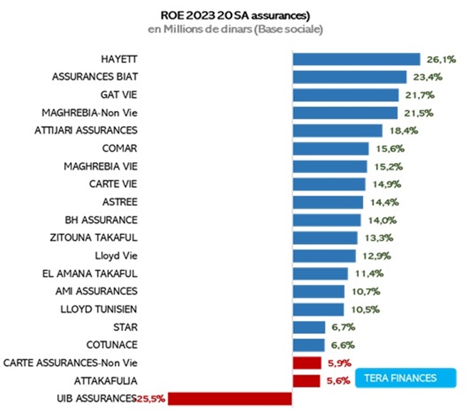 Enfin, en termes de rentabilité financière, le secteur de l’assurance directe améliore son ROE à 12% en 2023 contre 11,8% en 2022 (moyenne pondérée). Au top line du podium des sociétés les plus performantes, la Compagnie d’Assurance Vie et de Capitalisation HAYETT affiche un ROE de 26,1% traquée par Assurances BIAT avec un ROE de 23,4% et par GAT vie et Maghrebia non-vie, respectivement avec 21,7% et 21,5%.a