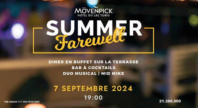 Tunisie-Tribune (Movenpick Hôtel) – L’été touche à sa fin et c’est déjà la rentrée ! Pour marquer cette occasion, le Mövenpick Hôtel du Lac Tunis est ravi de vous inviter à sa soirée “Summer Farewell” le 7 septembre 2024 à partir de 19h sur la terrasse du Grand Restaurant. Ce sera l’occasion parfaite de se retrouver entre amis ou en famille pour échanger sur les moments forts de l’été dans un cadre agréable au bord du lac.