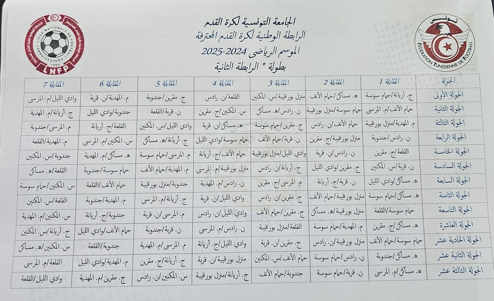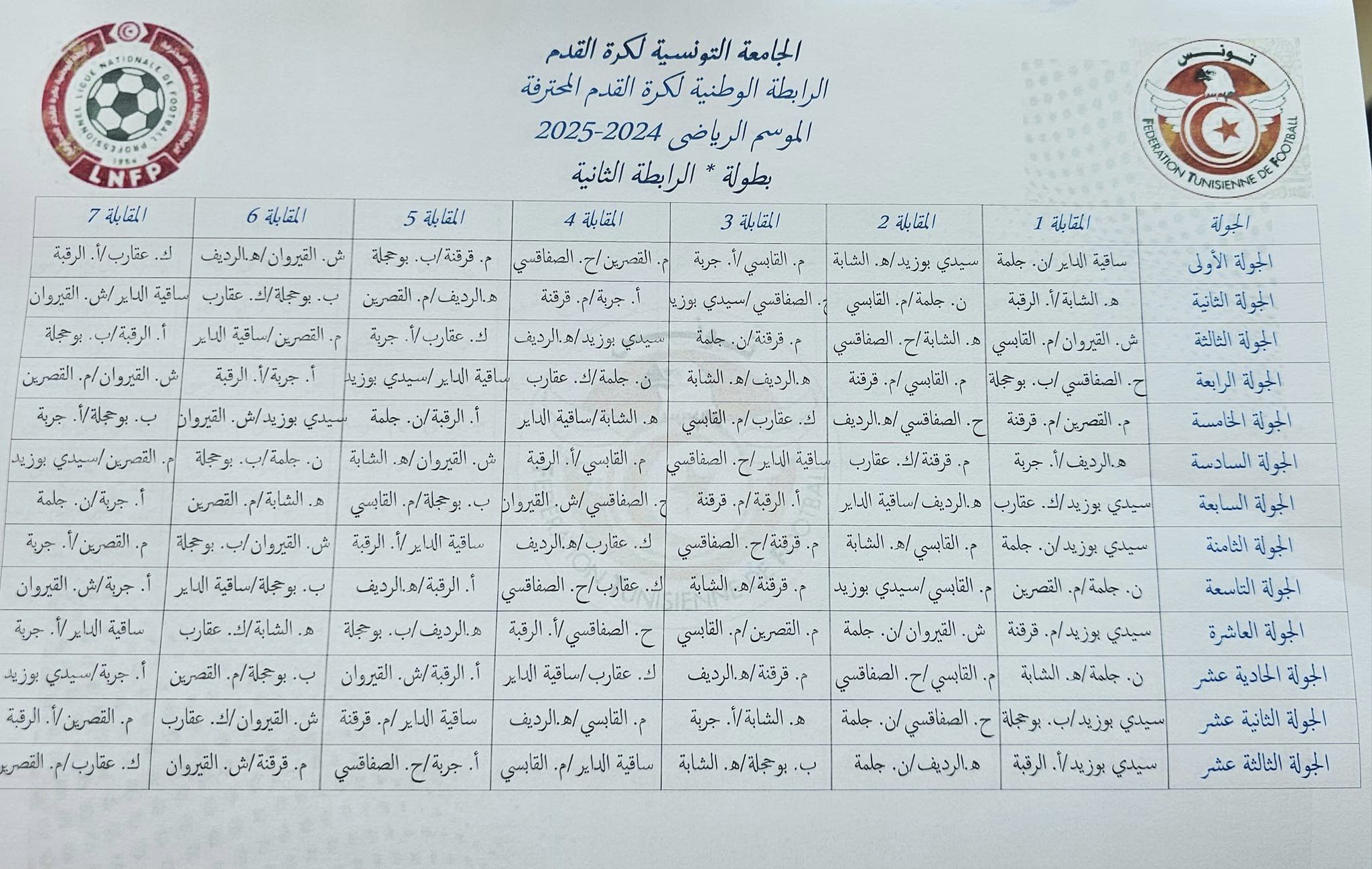 Accueil - A LA UNE Ligue 2 : Calendrier de la saison 2024-2025 des groupes A et... Ligue 2 : Calendrier de la saison 2024-2025 des groupes A et B Par Med Ben Mohmed - 17 septembre 2024 0 Tunisie-Tribune (Ligue 2) – Voici le calendrier de la saison 2024-2025 en Ligue 2 : ARTICLES CONNEXESPLUS DE L'AUTEUR - A LA UNE Stephen Wright, PDG de Windracers : « Nous ne sommes qu’aux prémices de cette technologie de drones » - A LA UNE La STEG poursuit le rééchelonnement des impayés de ses clients - A LA UNE Des pluies éparses et provisoirement orageuses attendues sur le Sud, ce jeudi - A LA UNE Affaire Chawki Tabib : l’audience reportée - A LA UNE Ooredoo élue Service Client de l’Année 2026 pour la 7ᵉ fois consécutive - A LA UNE Accord entre le Club Africain et Mohamed Dräger - A LA UNE Pluxee Tunisie élue Service Client de l’Année 2026 pour la 7ᵉ fois consécutive - A LA UNE Sélection tunisienne : Naim Sliti sera présent à la CAN 2025 - A LA UNE Hajj 2026 : Premier départ en mai DERNIERES NEWS Stephen Wright, PDG de Windracers : « Nous ne sommes qu’aux prémices de cette technologie de drones » Samir Belhassen - 18 décembre 2025 0 Tunisie-Tribune (technologie de drones) - L'entreprise britannique Windracers, spécialisée dans les drones de transport lourd, connaît une ascension fulgurante La STEG poursuit le rééchelonnement des impayés de ses clients 18 décembre 2025 Des pluies éparses et provisoirement orageuses attendues sur le Sud, ce... 18 décembre 2025 Affaire Chawki Tabib : l’audience reportée 18 décembre 2025 Ooredoo élue Service Client de l’Année 2026 pour la 7ᵉ fois... 18 décembre 2025 Accord entre le Club Africain et Mohamed Dräger 18 décembre 2025 Pluxee Tunisie élue Service Client de l’Année 2026 pour la 7ᵉ... 18 décembre 2025 Sélection tunisienne : Naim Sliti sera présent à la CAN 2025 18 décembre 2025 Hajj 2026 : Premier départ en mai 18 décembre 2025 La Bourse de Tunis classée en tête des marchés arabes 18 décembre 2025 FIFA: Deux nouveaux clubs de Ligue 1 interdits de recrutement 18 décembre 2025 Ligue 1 : Programme des rencontres amicales 18 décembre 2025 Conférence League : Programme des matches de la 6ème journée 18 décembre 2025 Programme des retransmissions TV des rencontres prévues ce jeudi 18 décembre 2025 Mehrez Berrajeh revient à l’Olympique de Béja 18 décembre 2025 Sélection tunisienne : Dernier test amical avant le départ au Maroc 18 décembre 2025 Basket-ball : Six clubs qualifiés en phase de play-off en Pro... 18 décembre 2025 Mondial 2026 : Des billets à prix réduit pour les supporters... 18 décembre 2025 Gaza : les agences humanitaires appellent Israël à lever les nouvelles... 18 décembre 2025 Vladimir Poutine promet d’atteindre ses objectifs en Ukraine 18 décembre 2025 Le Parlement européen vote pour faciliter l’accès à l’avortement dans l’UE 18 décembre 2025 La magistrate Monia Ammar nommée membre de la Commission d’enquête de... 18 décembre 2025 Prévisions météo du jeudi 18 décembre 2025 18 décembre 2025 Programme des matches amicaux de l’Union Sportive Monastirienne 17 décembre 2025 Marche populaire contre l’ingérence étrangère 17 décembre 2025 L’inscription du « khôl arabe » à l’UNESCO 17 décembre 2025 Kef : Dynamisme accru aux postes-frontaliers 17 décembre 2025 Lassaad Dridi officialisé à la tête du Club Sportif Constantinois 17 décembre 2025 France: Grève reconduite au Louvre 17 décembre 2025 Revirement Stratégique sur la voiture électrique : Face à des pertes... 17 décembre 2025 La Grande-Bretagne va réintégrer le programme Erasmus+ de l’UE 17 décembre 2025 Donald Trump accentue la pression sur le Venezuela 17 décembre 2025 Voitures électriques : En Europe, les ventes progressent alors que des... 17 décembre 2025 Coupe Arabe des Nations 2025 : Les arbitres des matches de... 17 décembre 2025 Handball : Programme de mercredi à la 19ème journée Elites 17 décembre 2025 Journalistes tués à Gaza : le bilan tragique des opérations militaires... 17 décembre 2025 Accélération de la colonisation israélienne : colline après colline, la paix... 17 décembre 2025 Un nouveau variant de la grippe se propage rapidement 17 décembre 2025 Programme des retransmissions TV des rencontres de ce mercredi 17 décembre 2025 Liste complète des lauréats des trophées The Best FIFA Football Awards... 17 décembre 2025 Affaire Al Karama Holding : report du procès 17 décembre 2025 15ᵉ anniversaire du déclenchement de la révolution 17 décembre 2025 Inauguration de la première centrale photovoltaïque à Kairouan 17 décembre 2025 Prévisions météo du mercredi 17 décembre 2025 17 décembre 2025 beIN SPORTS : 15 heures de direct quotidien sur 4 chaînes... 16 décembre 2025 Le chiffre de l’année : Kaspersky a détecté quotidiennement un demi-million... 16 décembre 2025 Un nouveau directeur technique au Club Athlétique Bizertin 16 décembre 2025 Loi de Finances 2026 (Article 23) : Un Impôt Annuel sur... 16 décembre 2025 Hausse des arrivées algériennes à Yasmine Hammamet 16 décembre 2025 La banque de Tunisie couronnée « Bank of the year »... 16 décembre 2025 Bourse de Tunis : Le marché boursier perd du terrain… TAWASOL... 16 décembre 2025 Le GITAS renforce la présence de l’industrie aéronautique tunisienne au Hamburg... 16 décembre 2025